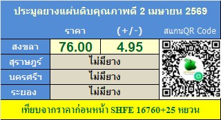 ราคาประมูลแผ่นดิบ : ตลาดสงขลา 76 บาท/กก. ราคาเพิ่มขึ้น 4.95บาท/กก. ปริมาณยาง 1,032 กก.