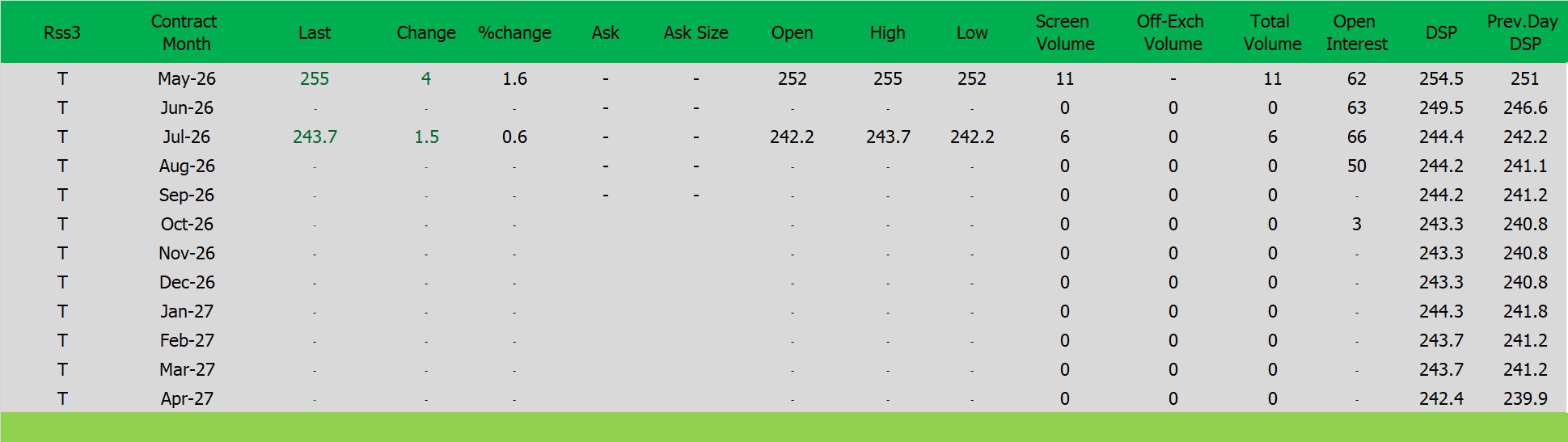 ราคาปิดตลาดยาง SICOMประจำวัน อังคาร ที่ 7เมษายน2569ราคายาง RSS3 ราคาเดือนพ.ค. ราคาเพิ่มขึ้น 4เซนต์สหรัฐ ปิดที่ 255 เซนต์สหรัฐ