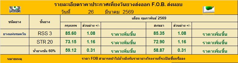 รายละเอียดราคาประกาศเที่ยงวันยางส่งออก F.O.B. ส่งมอบ ประจำวัน พฤหัสฯ ที่ 26  มีนาคม  2569
