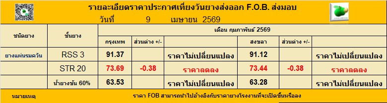 ราคายางเฉลี่ยของโรงงาน และท้องถิ่นทั่วไป ประจำวัน พฤหัสฯ ที่ 9 เมษายน 2569