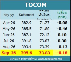 ราคาปิดตลาด TOCOM-RSS3 ช่วง Day Session ประจำวัน พฤหัสฯ ที่ 9 เมษายน 2569ก.ย.-2026 ลดลง -0.9เยน Settle อยู่ที่ 395.60เยน ปริมาณ 478 สัญญา