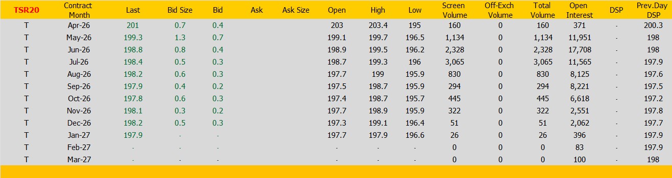 ราคายางTSR20 ตลาดยางSICOM ราคาส่งมอบเดือน เม.ย.ปิดที่201 เซนต์สหรัฐ ราคาเพิ่มขึ้น 0.7 เซนต์สหรัฐหรือ คิดเป็นเปอร์เซนต์ +0.35% %