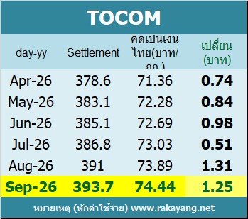 ราคาปิดตลาด TOCOM-RSS3 ช่วง Day Session ประจำวัน ศุกร์ ที่ 3 เมษายน 2569ก.ย.-2026 เพิ่มขึ้น 6.1เยน Settle อยู่ที่ 393.70เยน ปริมาณ 225 สัญญา