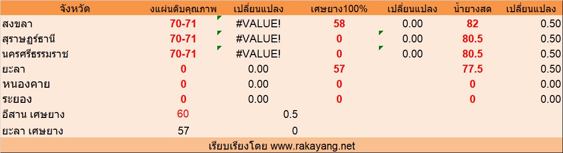 จังหวัด สงขลา ยางแผ่นดิบคุณภาพ 3  = 70-71บาท/กก. ราคาไม่เปลี่ยนแปลง เศษยาง 58บาท/กก. ราคาไม่เปลี่ยนแปลง  บาท/กก. น้ำยางสด ราคา ณ โรงงาน 82บาท/กก. ราคาเพิ่มขึ้น 0.50บาท